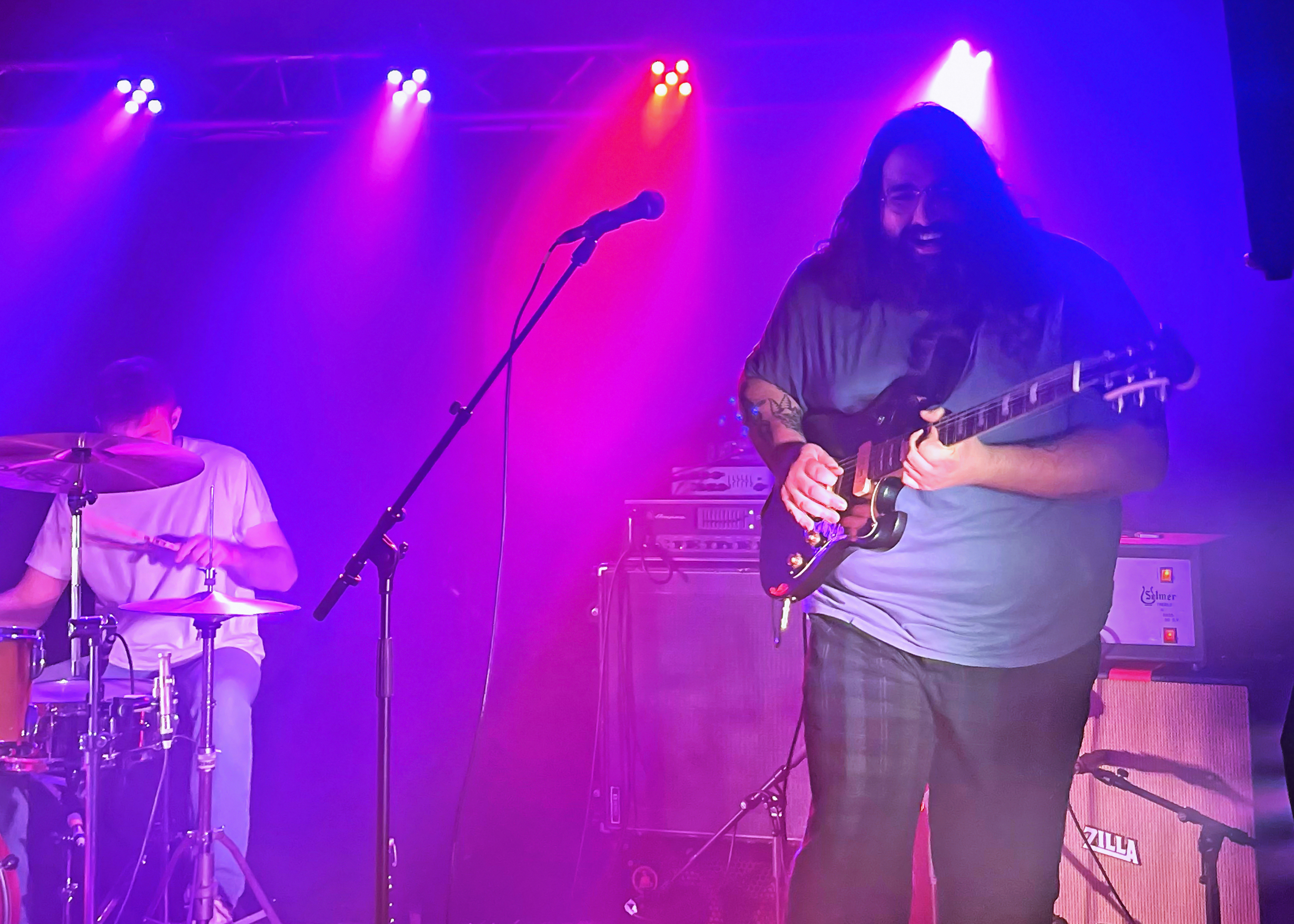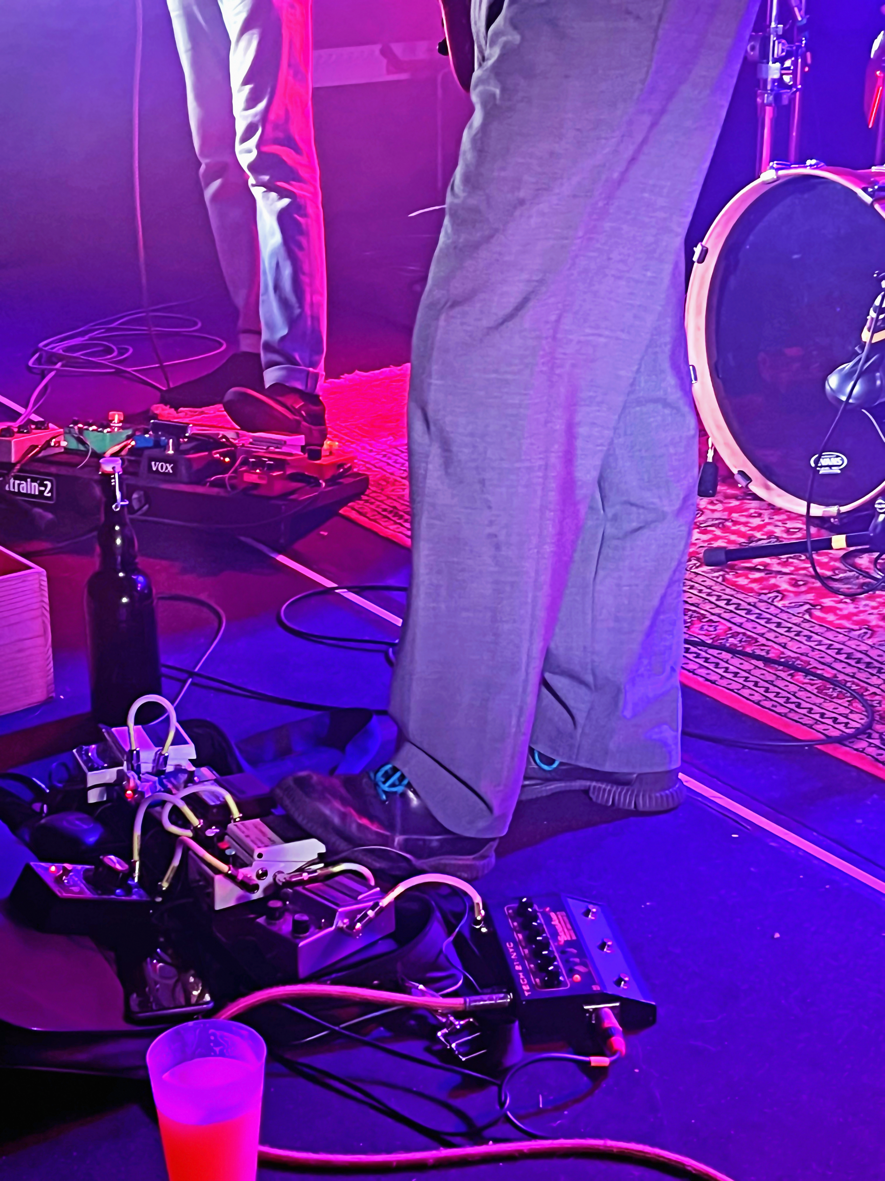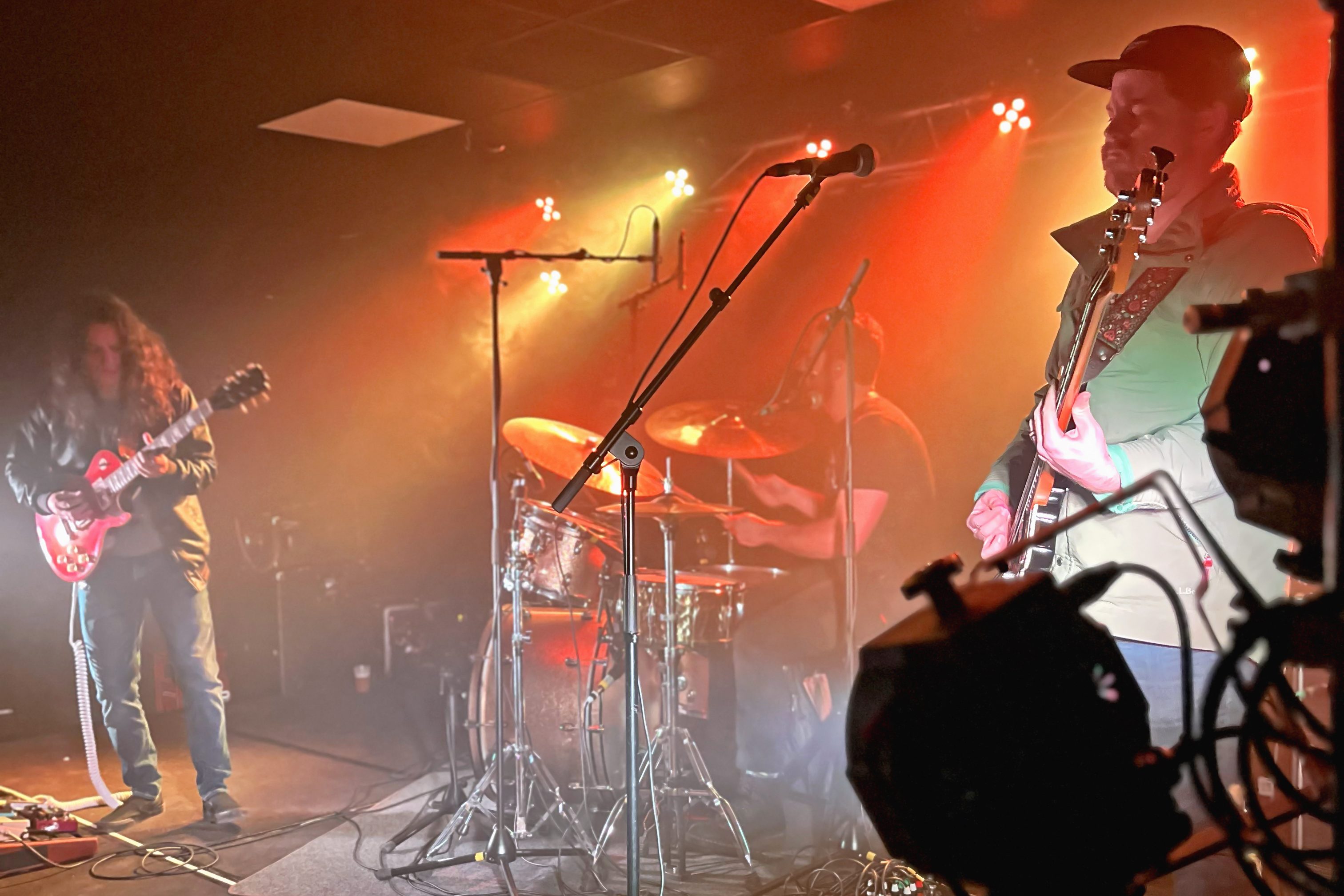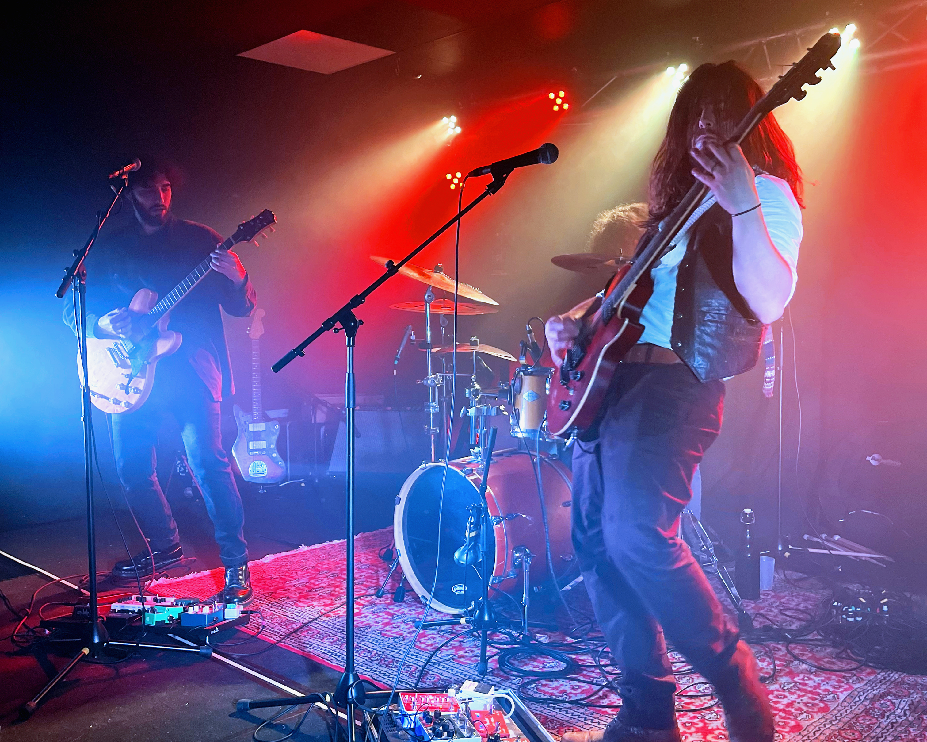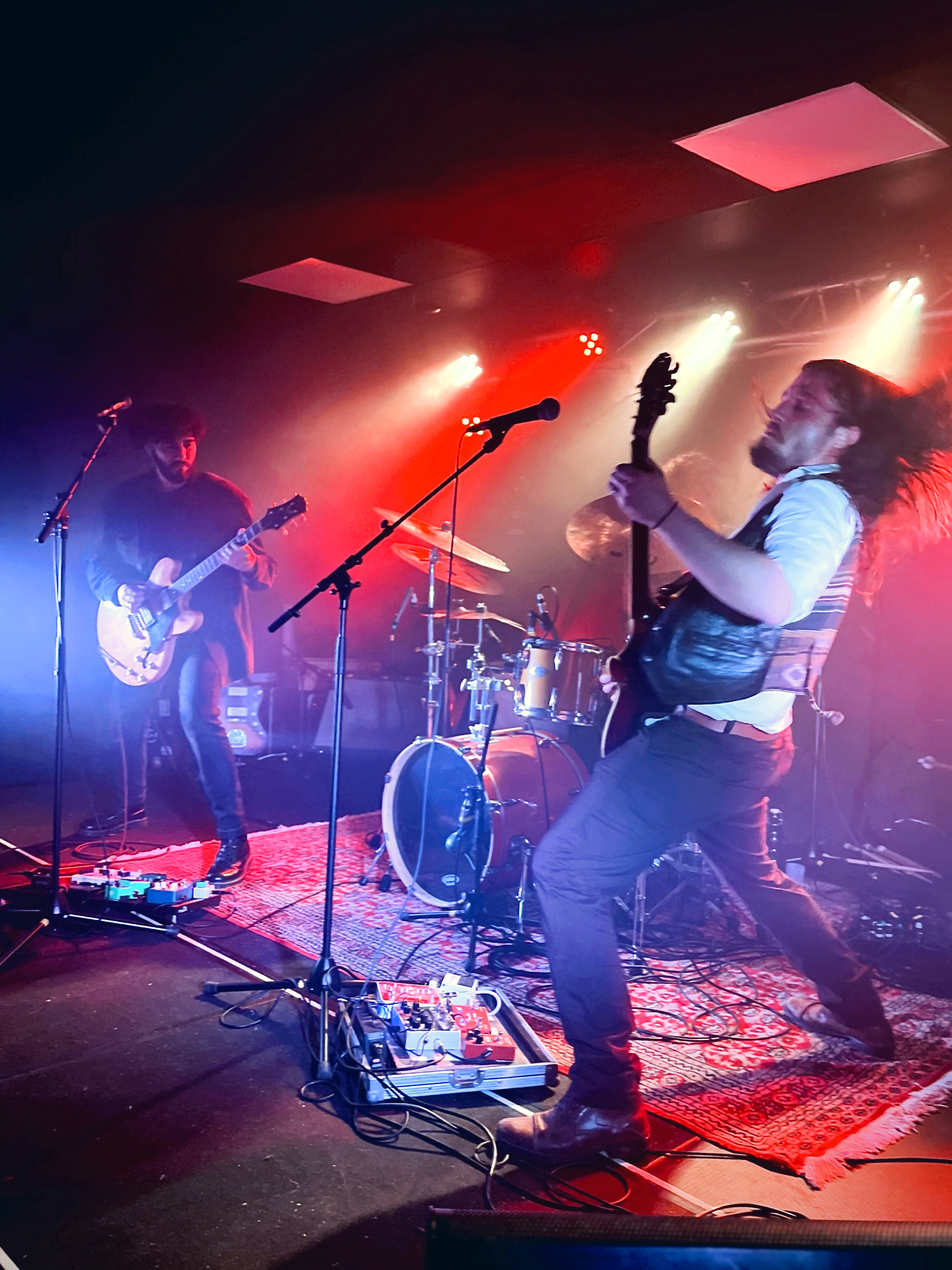 ⇢ Maîtrise parfaite des compo et de la scène, exécution des titres bien assurée, son propre, tout bien calé, musiciens maîtres de leurs moyens et de la scène qui savaient parfaitement quoi faire et où aller, enchainements des compositions et niveaux sonores équilibrés, groupe complètement dans les titres et ancrés dans la scène mais bien ouvert au public happé par les instru, englouti par les vibrations, enchaîné aux accords, frappé avec délectation par les fouets mélodiques… Osmose générale.